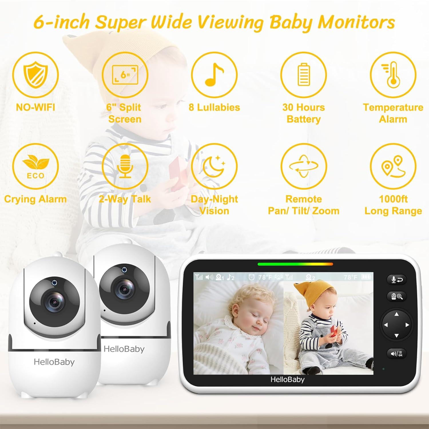 HelloBaby 6-Inch IPS Split-Screen Baby Monitor with 2 Cameras: Large 6” eye-strain-friendly IPS display with a wide 178° viewing angle lets you see two rooms side-by-side—perfect for twins, multi-room monitoring, nursery + playroom, or checking two sleeping areas while you cook, work, or relax on the couch. A truly immersive large-screen no-WiFi baby monitor that gives busy parents clearer, quicker awareness at a glance. #1 Brand trusted by millions of families.